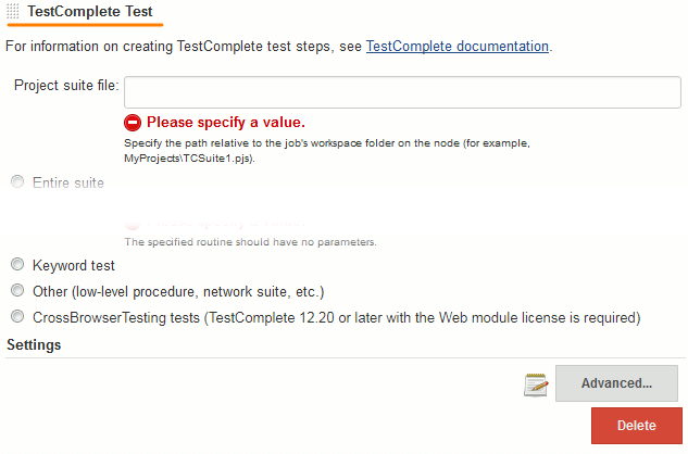 4. Click Advanced to configure additional settings of the TestComplete Test step:
