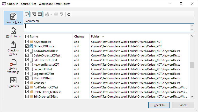 Select File > Source Control > Add to Team Foundation Server from the TestComplete main menu.