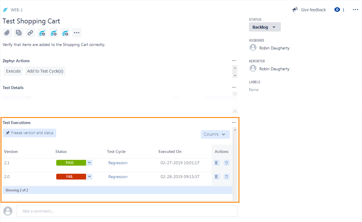 TestComplete sends the test status (Pass or Fail) to Jira and assigns it to the specified test case execution. You can view it in the Test Execution section of the test case in Jira: