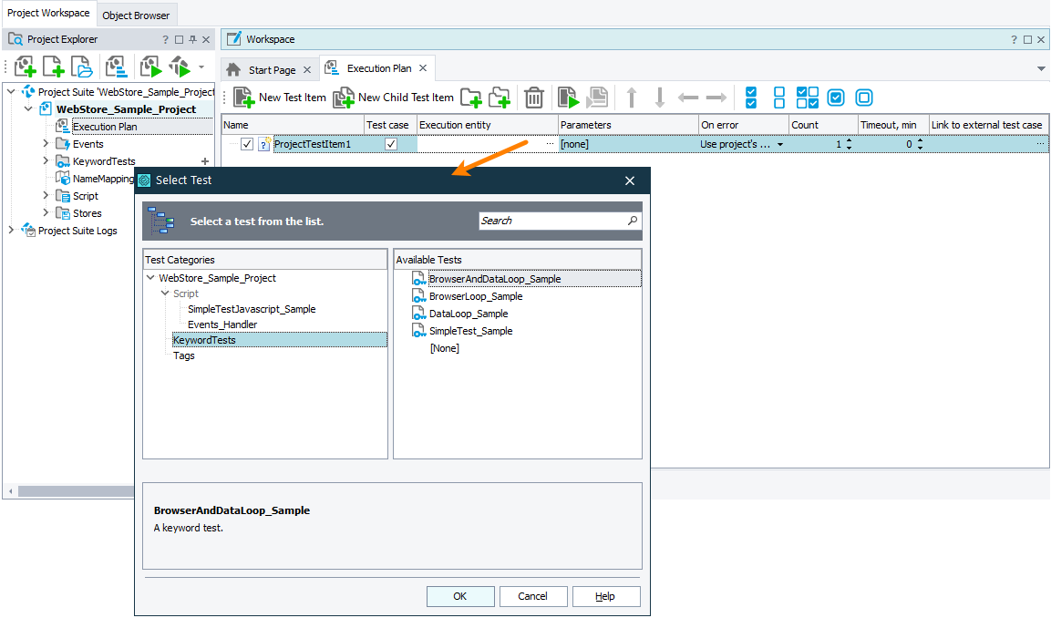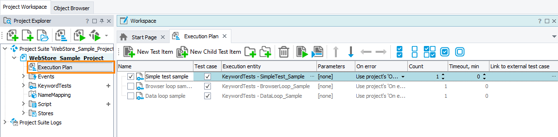 1. Switch to the Execution Plan editor of your project. This editor specifies the tests to be run when you run your test project.
