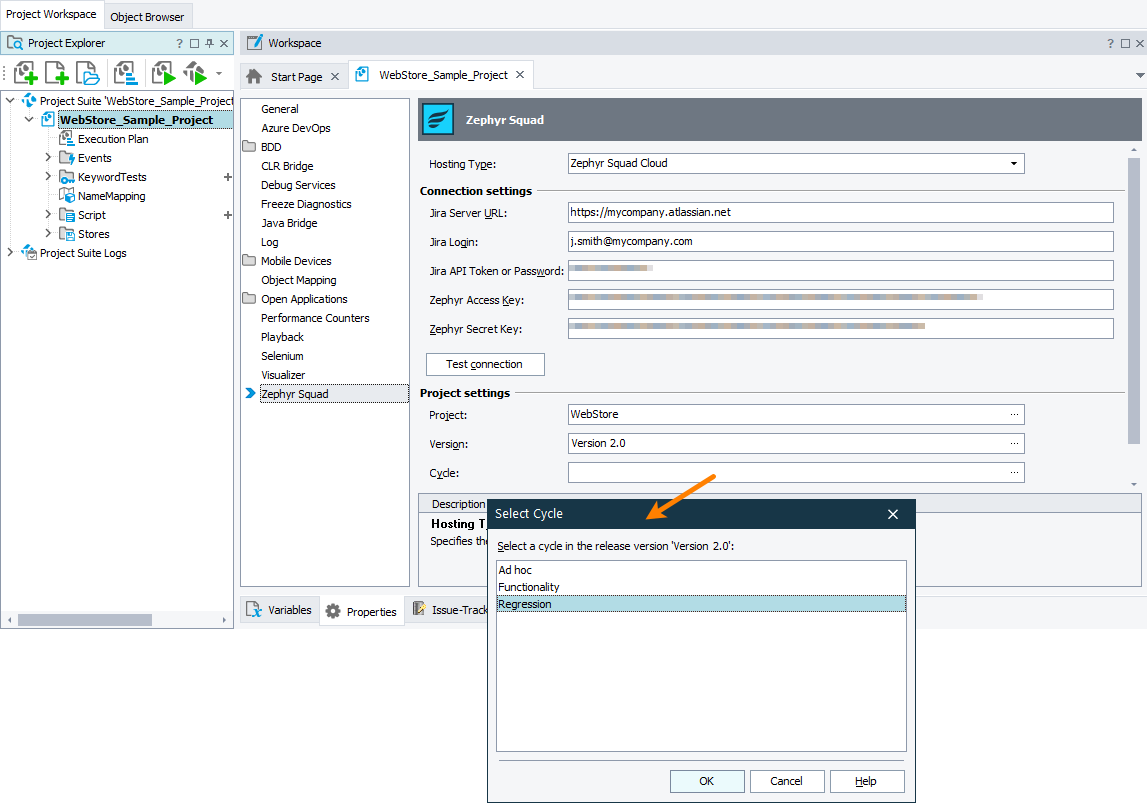 If you use Zephyr Squad Cloud, you will need Zephyr API keys to access Zephyr test cases from TestComplete: