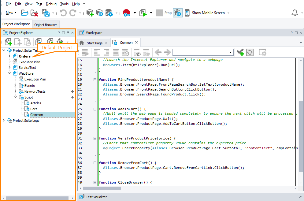 A TestComplete project is a container of all scripts, images and files required for your testing efforts. It is the starting point for authoring tests in TestComplete. Each project is included into a project suite that may contain the several projects independent of each other.