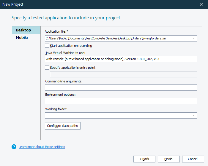 In the New Project wizard, you can add Java tested applications to your project. To do this, you choose the Tested application check box on the first page of the wizard, and on the subsequent page, you select Desktop and enter the path to a .jar file. The wizard will display additional parameters to configure. Here is a sample view of the page: