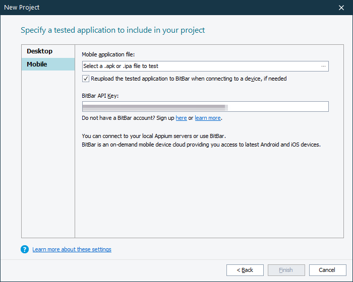 2. (Optional) In the BitBar API Key text box, enter the API key assigned to the BitBar account you will use to run automated mobile tests in the BitBar device cloud.