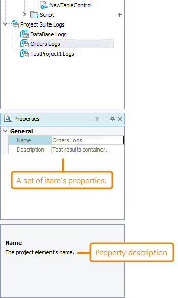 The Properties panel displays different sets of properties depending on the type of item to which they correspond. For example, if you select the Project Suite Log node, the Properties panel will display its name and description. If you select a test log item, the Properties panel will display its name and the computer and user names that were used to execute the corresponding test. For information on the meaning of a certain property, select it in the panel. The description will be displayed at the bottom of the Properties panel.