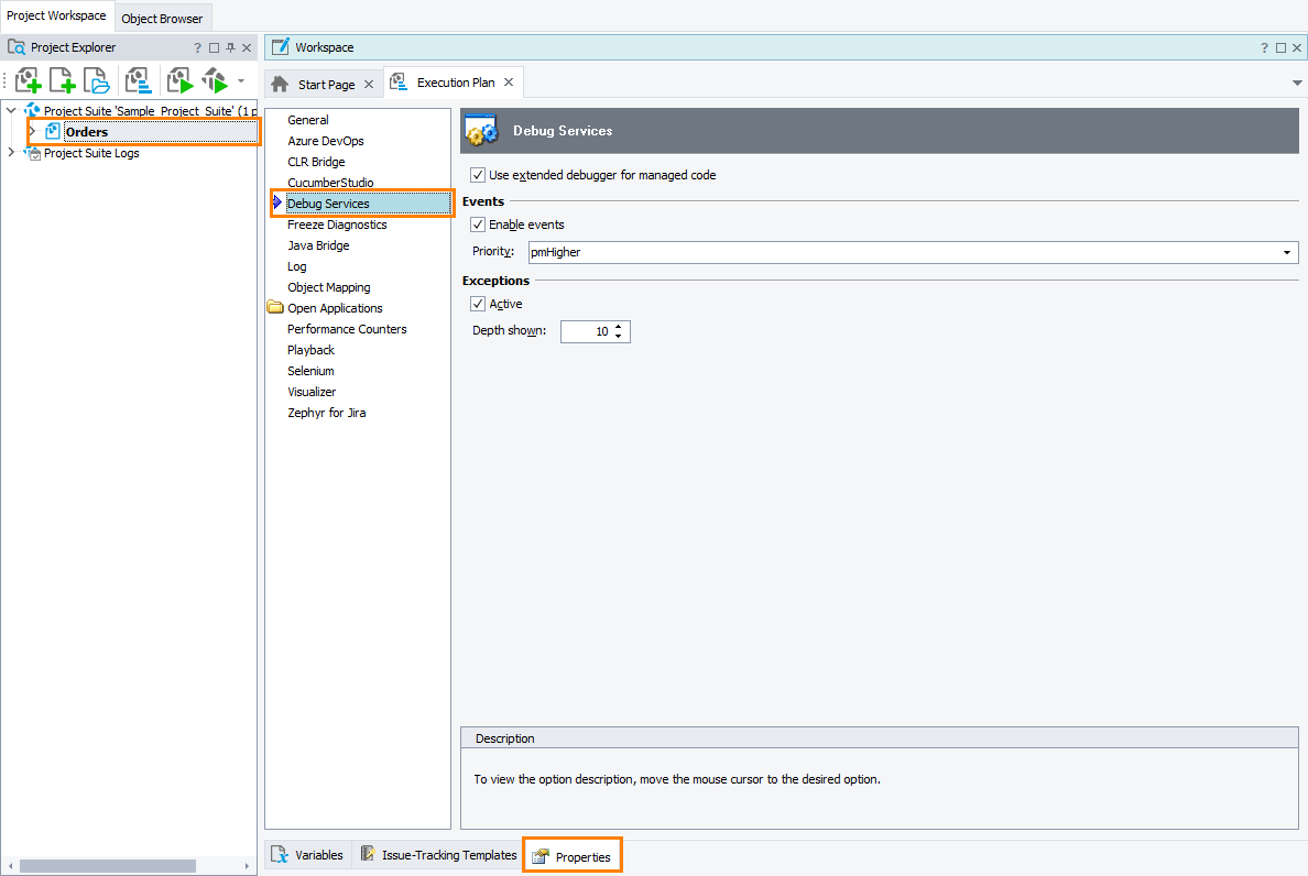 TestComplete Project Properties - Debug Services