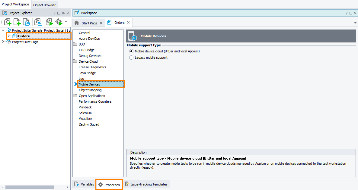 You use the Mobile Devices project properties to configure mobile testing in your project.