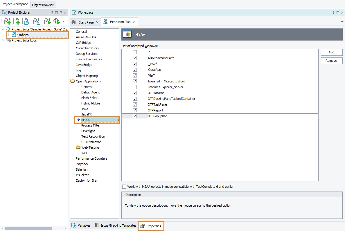 Work with MSAA objects in mode compatible with TestComplete 6 and earlier – Specifies the format in which TestComplete addresses objects exposed by the MSAA engine.