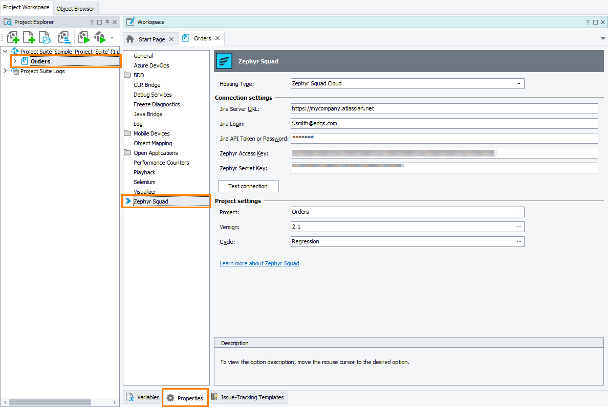 To set the default values of the Zephyr options for new TestComplete projects, use the Default Project Properties - Zephyr Squad Options dialog.