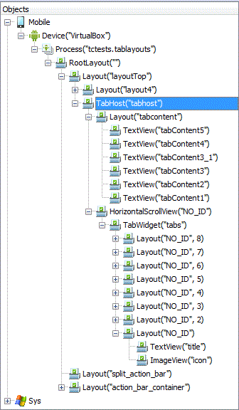 Android tab host object is a container for a tabbed window view. Here is a sample view of the TabHost object and its child objects in the Object Browser: