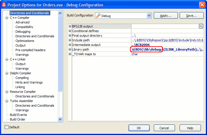 5. Switch to the Directories and Conditionals category and examine the Library path. If the path contains the $(BDS)\lib\release folder, replace it with $(BDS)\lib\debug: