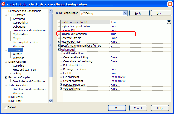 4. Switch to the C++ Linker category and set the Full debug information option to True: