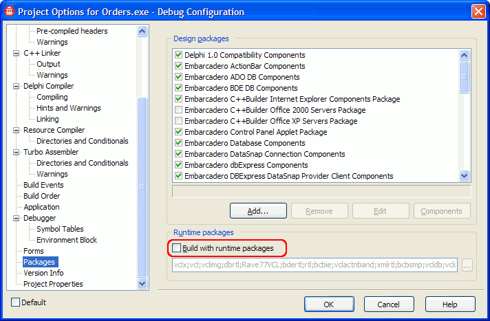 If this property is checked, C++Builder creates Borland package library (.bpl) files when compiling the application. TestComplete cannot access debug information in these files and some controls. If this property is unchecked, all information is included in a single executable and can be accessed by TestComplete. For more information about runtime packeges, see About Runtime Packages.