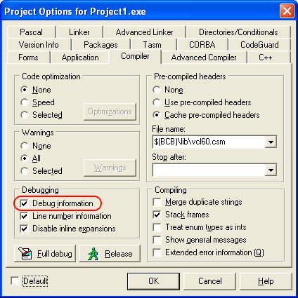3. Select the Compiler tab and enable the Debug information option in the Debugging group: