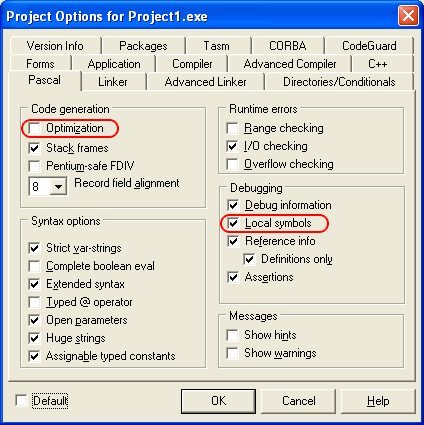 7. To see the names of method parameters in the Object Browser panel, switch to the Pascal tab, turn off the Optimization option and enable the Local symbols option: