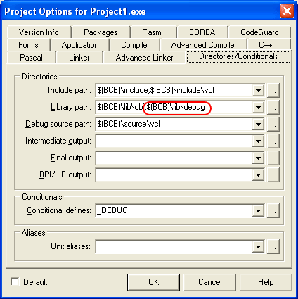 5. Switch to the Directories/Conditionals tab and examine the Library path. If the path contains the $(BCB)\lib\release directory, replace it with $(BCB)\lib\debug: