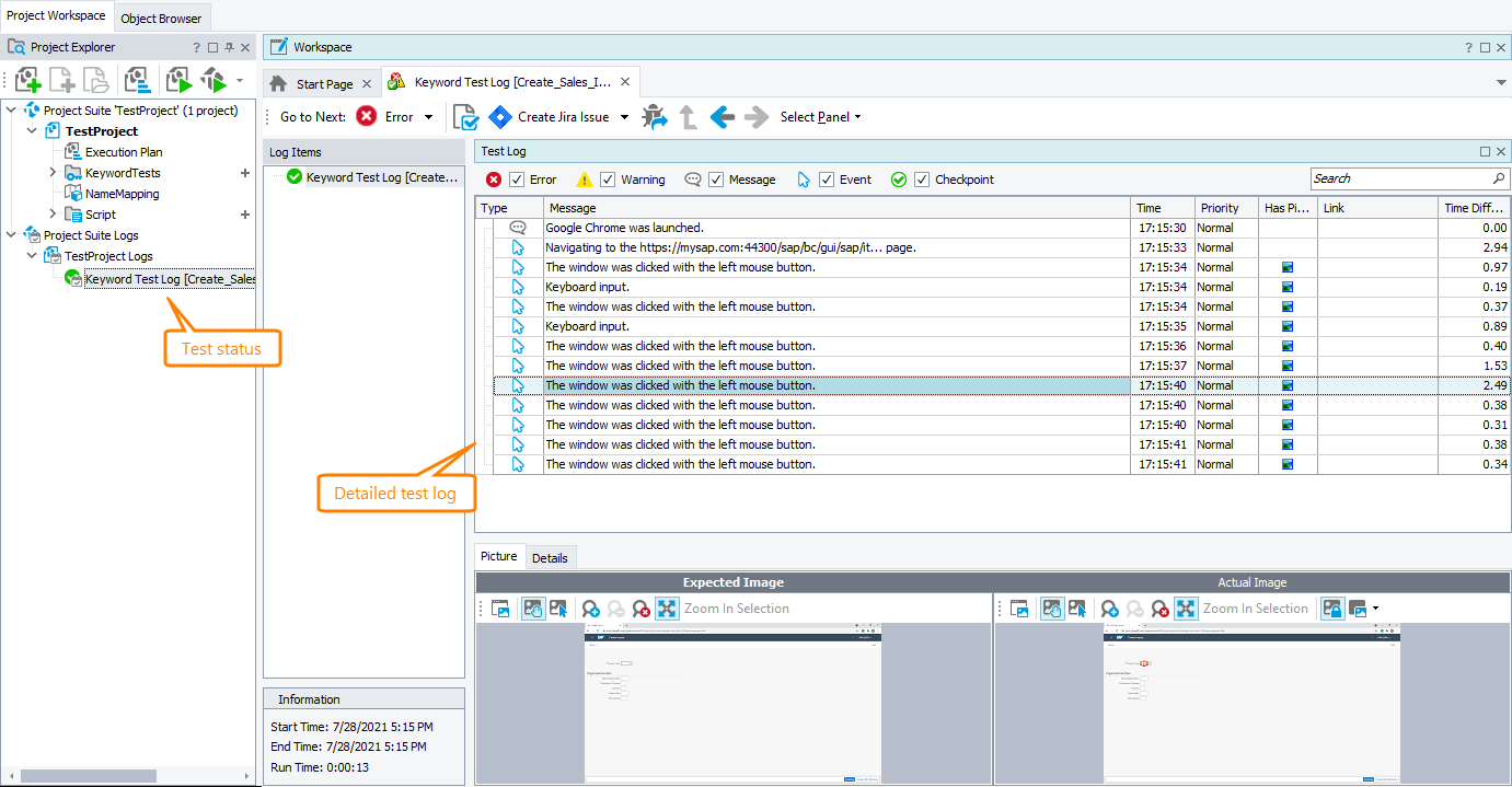 TestComplete will process the performed actions and generate the test. The images below show an example of a recorded test that simulates user actions over SAP Web:
