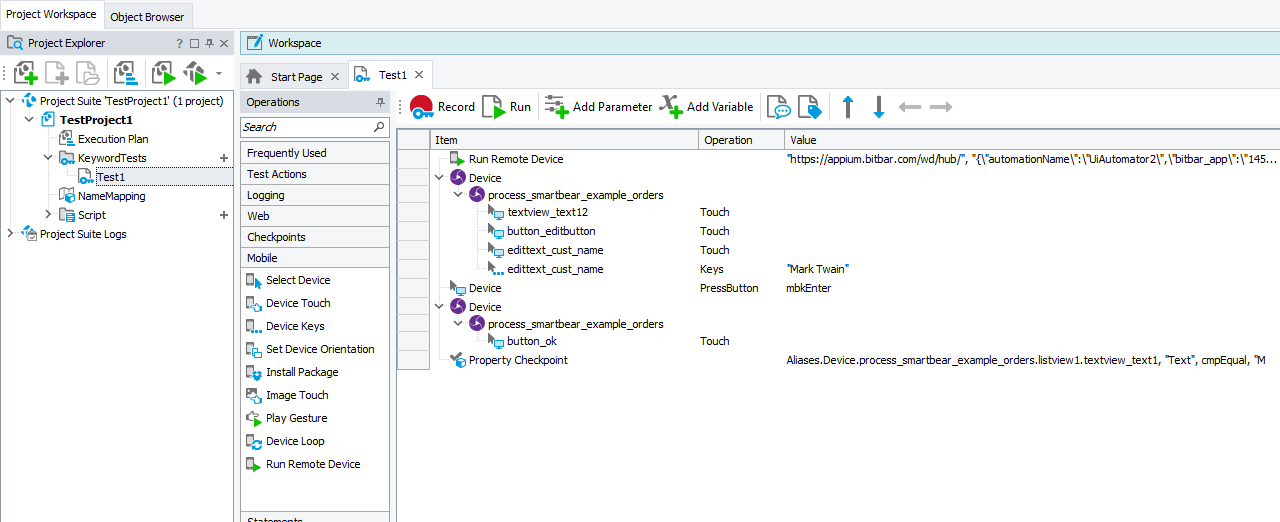 TestComplete will process the recorded actions and generate the test. The images below show an example of a recorded mobile test: