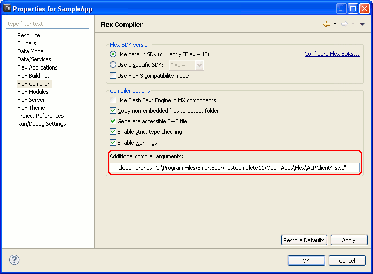 In order for TestComplete to be able to access objects of a Flex-based AIR application, you need to include the AIRClient helper library in the application and recompile it. Three versions of this library are shipped along with TestComplete and reside in the <TestComplete>\Open Apps\Flex folder. Each of the library versions is intended for a certain version of Flex SDK used to compile the application: