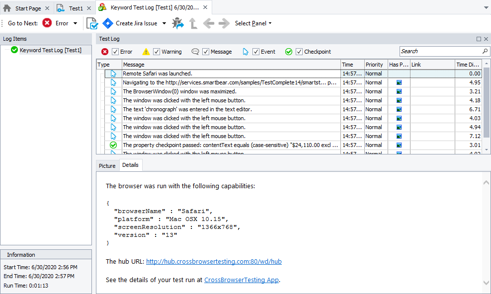 TestComplete will connect to your device cloud, command it to start Safari on a suitable node, and execute test commands there.
