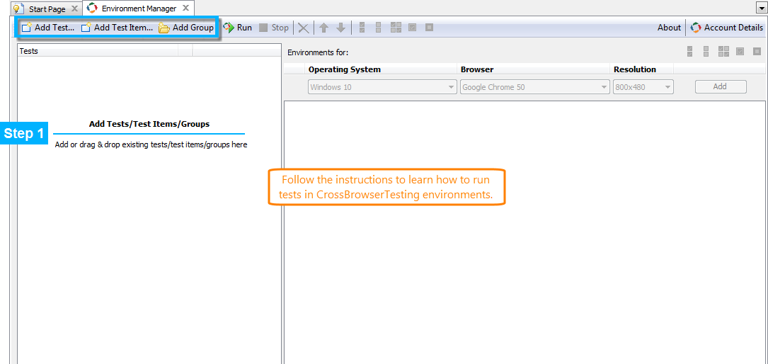 To make the start for a novice user easier, the Environment Manager now shows quick tips on running tests in CrossBrowserTesting environments: