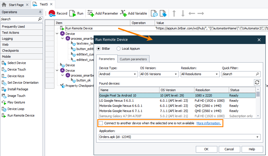 This way, your test will not fail but will run on another similar device. See Select a Device to Connect.