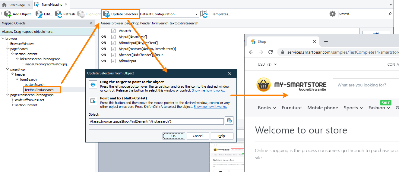 • Easier update of CSS selectors. If your tested web application has been changed, you may need to update the XPath expressions and CSS selectors that the test engine uses to recognize web objects. Now, you can do this quickly by pointing to the needed object on the screen. TestComplete will replace the existing XPath expressions and CSS selectors with the actual values the target web object has. See Update Selectors for Web Objects.