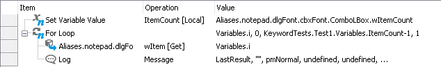 The following image shows a sample keyword test that iterates through a collection of combo box items and posts their text to the test log: