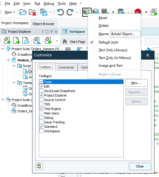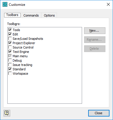 Right-click any toolbar and select Customize from the context menu or select Tools | Customize Toolbar from the TestComplete main menu. This will bring up the Toolbar Customization dialog: