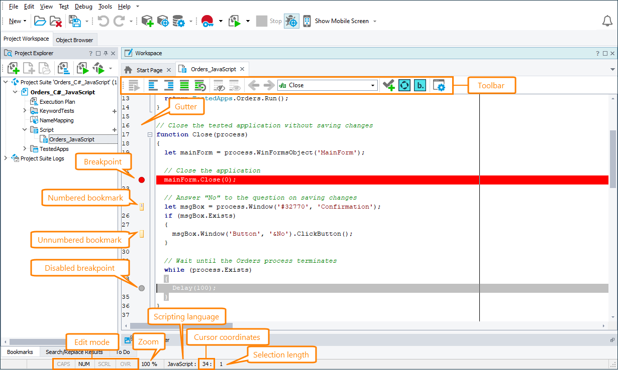 TestComplete tracks changes made to script code in the Code Editor and automatically highlights them with yellow marks on the left of each changed line. After you have saved the changes, the yellow marks change to green: