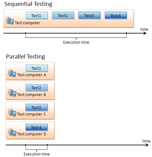 Do not confuse parallel tests with distributed tests. Both of these kinds of tests consist of several parts that are performed on separate computers. However, distributed testing implies that test parts interact with each other during the test run, while the parallel testing approach is free from any interaction between test parts.