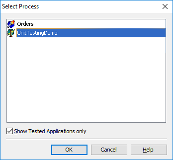 The dialog lists all processes running in the operating system. Select the Show Tested Applications only check box to filter out applications added to the project’s Tested Applications collection.