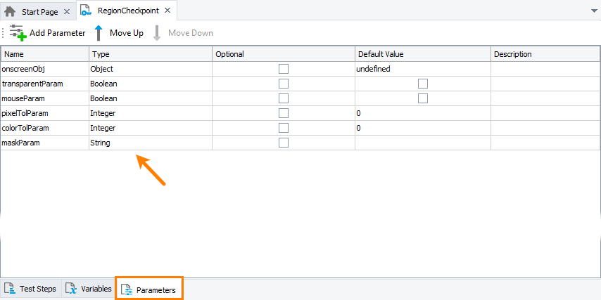 Region checkpoints take parameters that specify the actual image to be verified and comparison settings (for example, pixel and color tolerance, comparison mask and so on). For detailed information on region checkpoint parameters, see the description of the Region Checkpoint keyword test operation or the description of the Regions.RegionCheckpointName.Check scripting method. The name of the baseline image used by the region checkpoint is specified by the checkpoint name.