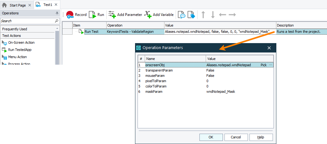 The image below demonstrates two region checkpoints. One of them verifies the image of the object using the hard-coded name of the onscreen object to verify and the hard-coded values of comparison parameters, the other one uses the object’s name and values of comparison parameters stored in the keyword test parameters:
