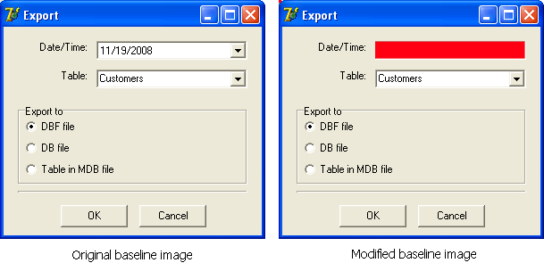After you perform these actions, you can use the baseline copy for comparison. For instance, in the picture below, the “transparent” color is red and the Date/Time edit field will be excluded from comparison:
