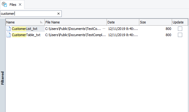 The Files collection can contain a great number of files. To search for a file in the collection quickly, start typing the file name in the Quick Search edit box at the top of the editor. The editor will filter out the items in the list according to the text you are typing: