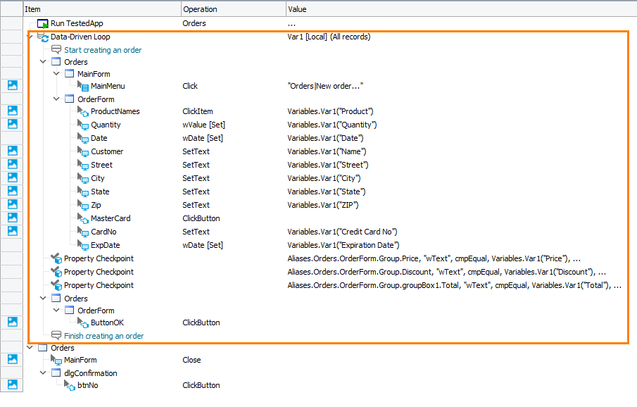 After you click Finish, TestComplete will add the Data-Driven Loop operation to the recorded test and move the selected operations as its child operations. Also, it will update the parameters of the moved operations with the values specified in the Data-Driven Loop wizard.