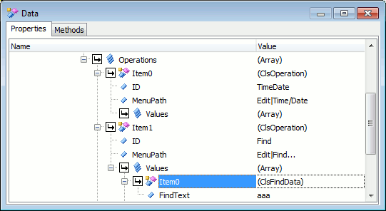 • Select (ClsFindData) from the drop-down list of the Value column for the new array item. The only property of the ClsFindData class will appear as a child node of the Item0 object’s node.