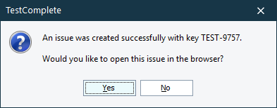 8. If the issue has been created successfully, TestComplete shows the issue ID and offers to open the issue in your browser. Click Yes to open the issue or No to close the dialog.