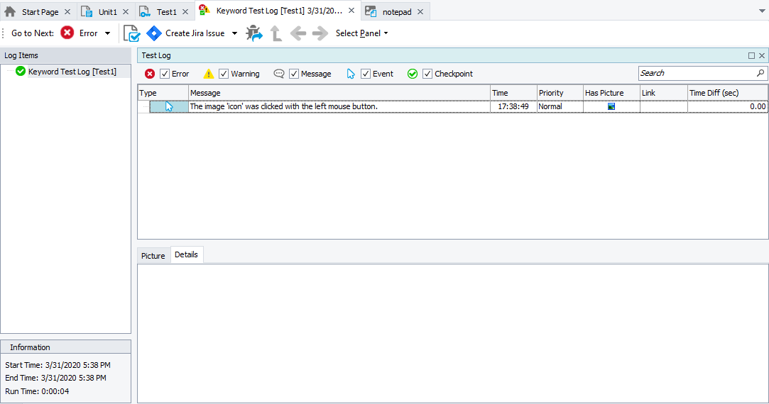 Note: The Notepad application must be running and activated on screen. Either run it manually, or add a command that will start the application at the beginning of your test.