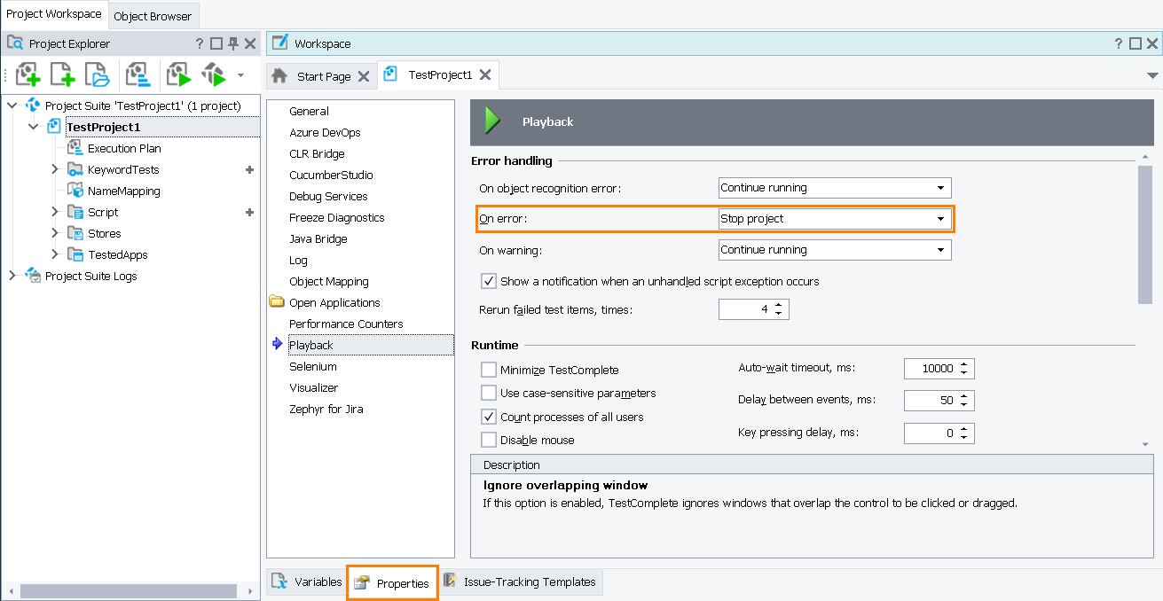 2. On the Properties page of your project, set the Playback > Error handling > On error property of your project to Stop project: