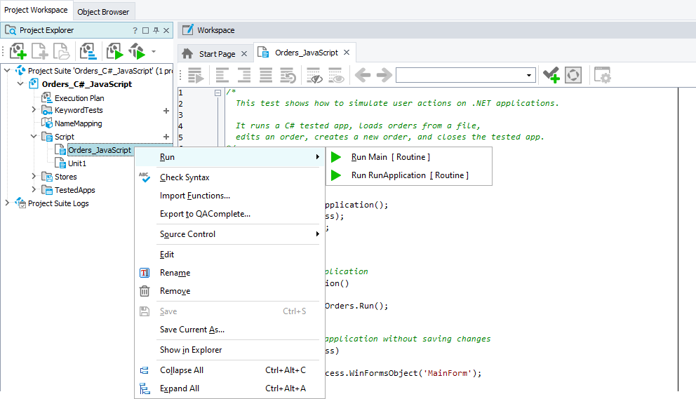 Right-click the needed script unit in the Project Explorer and select Run | Run RoutineName from the context menu.
