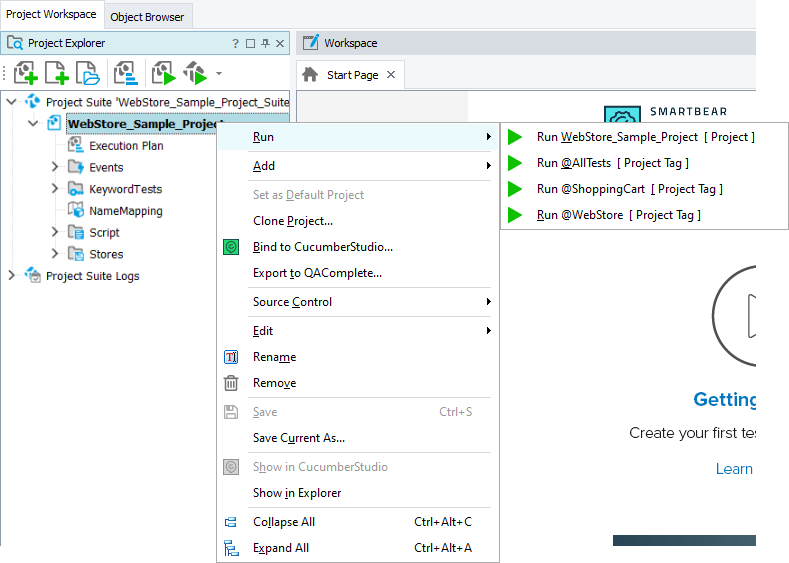 Select Run > Run Project or Run > Run Project Suite from the Test Engine toolbar.