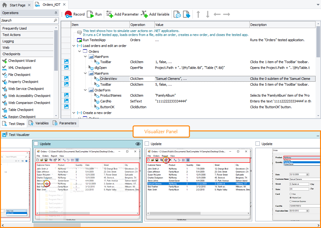 Test Visualizer captures screenshots for user actions (mouse clicks, keypresses, menu item selections and so on) during test recording or playback and associates the captured images with appropriate test commands. These images help you to understand what actions the test commands perform better.