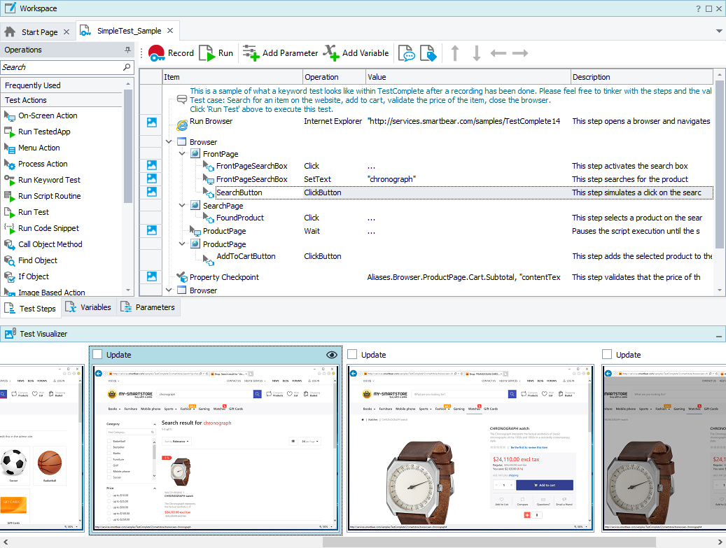 Suppose that you recorded a long test that contains many mouse clicks, keystrokes and other user actions. When viewing the recorded commands, it may be difficult to understand which control received a click or keyword input. It would be easier to identify this, if the recorded commands were accompanied by screenshots. This is what the TestComplete Test Visualizer does: it captures screenshots during test recording or playback for each user action: mouse click, keyboard input, menu item selection and so on. The screenshots help you better understand what actions the test commands perform.