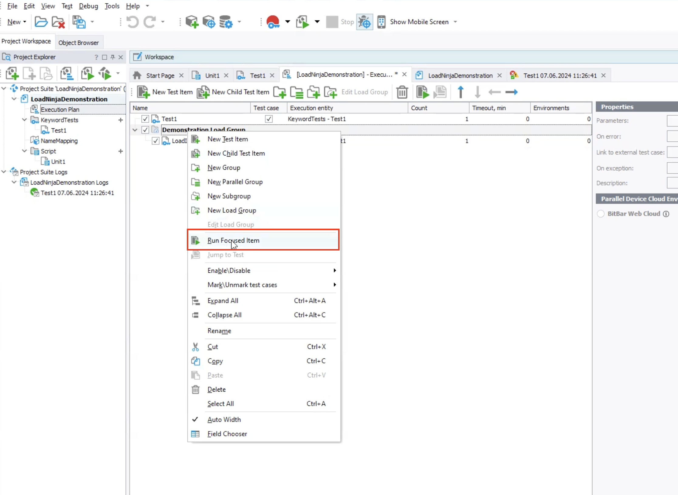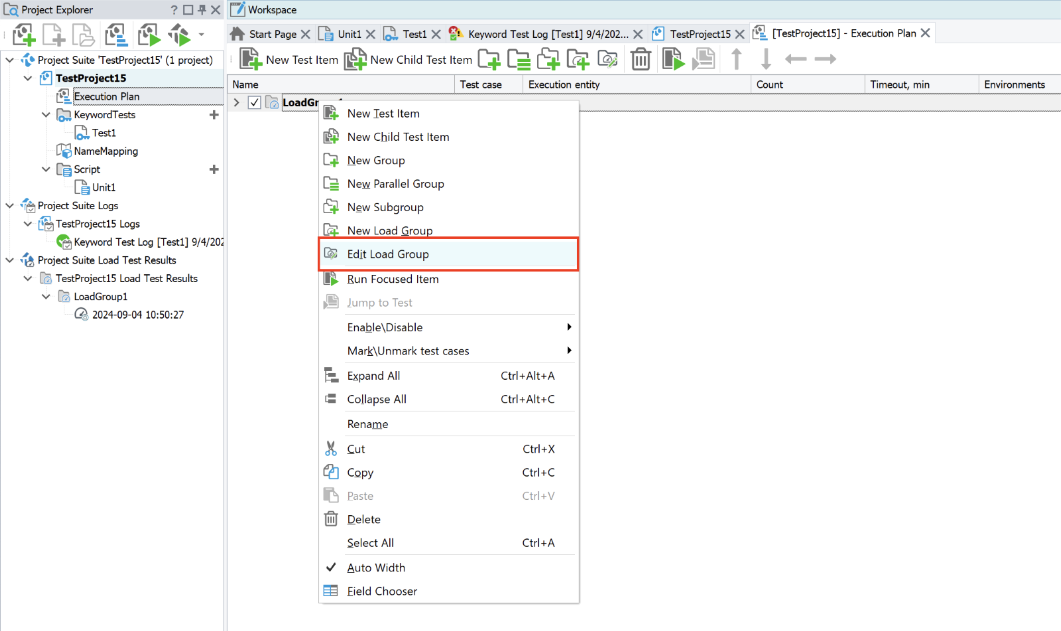 After you've created the load group, add the desired keyword or script tests (that you want to run as a load test) to this group. Right-click on the selected keyword or script test and select the "Add to Load Group" option. You can also drag the test onto the created load group.
