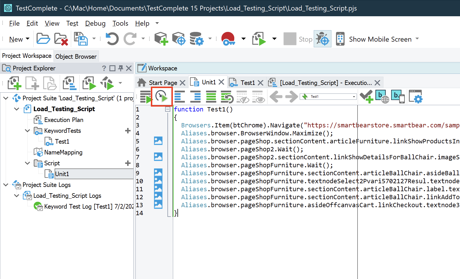 Note: Make sure the load testing extension is turned on in TestComplete in File -> Install Extensions -> Load Testing