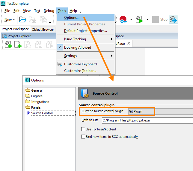 4. Open the Tools > Options > Source Control dialog and configure TestComplete to use to the Git Plugin as a current source control plugin: