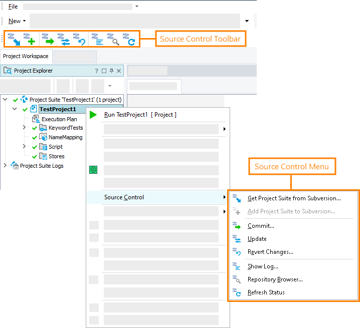 To work with Subversion, you can use the following elements in TestComplete IDE: