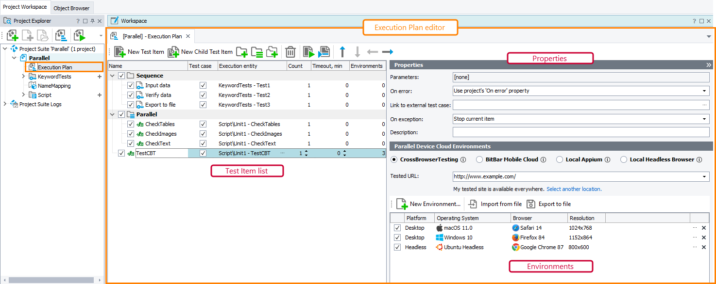 Use the panel to configure a list of test items that will run in the specified order. It could be a plain list, grouped list, a tree-like structure where child items are run after the parent item has finished running, or a parallel group where test items are run simultaneously. Also, the panel allows you to modify several test item’s settings.